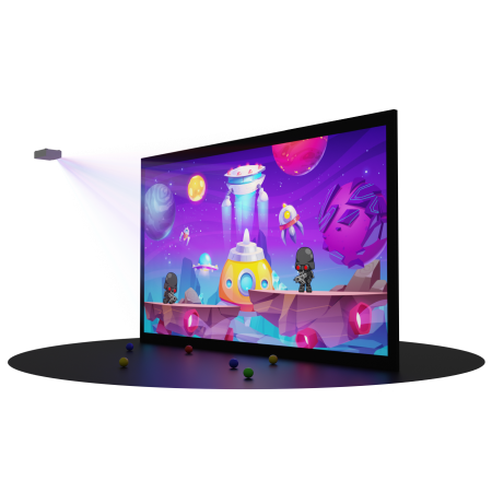 Работает на любой стене без капитального ремонта. Управляется мягкими мячами, реагирует мгновенно. Подходит даже для самых маленьких детей! В комплекте всё необходимое: проектор, сенсоры, планшет, игры, крепления и мячики!