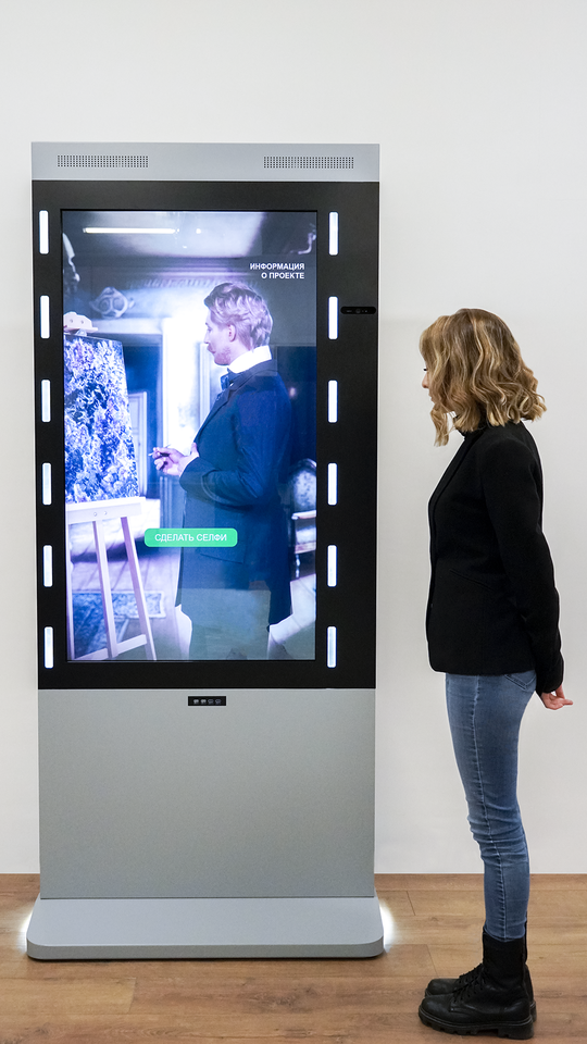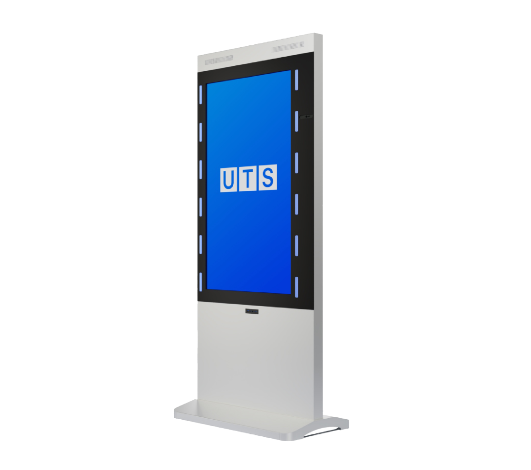 Напольный информационный киоск, оснащенный высококачественной камерой Logitech Brio и двусторонней подсветкой